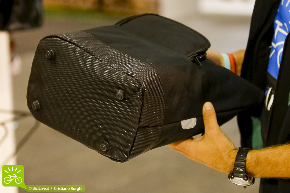 Inserti in materiale riflettente, comode maniglie per trasportarla una volta scesi dalla bici, ganci posteriori per fissarla al portapacchi e un pratico scomparto interno con chiusura a corda e velcro. Fondo in materiale impermeabile e antigraffio.