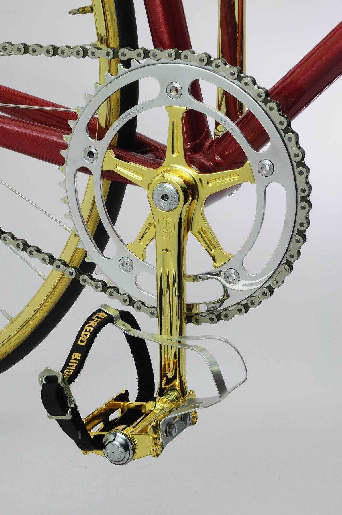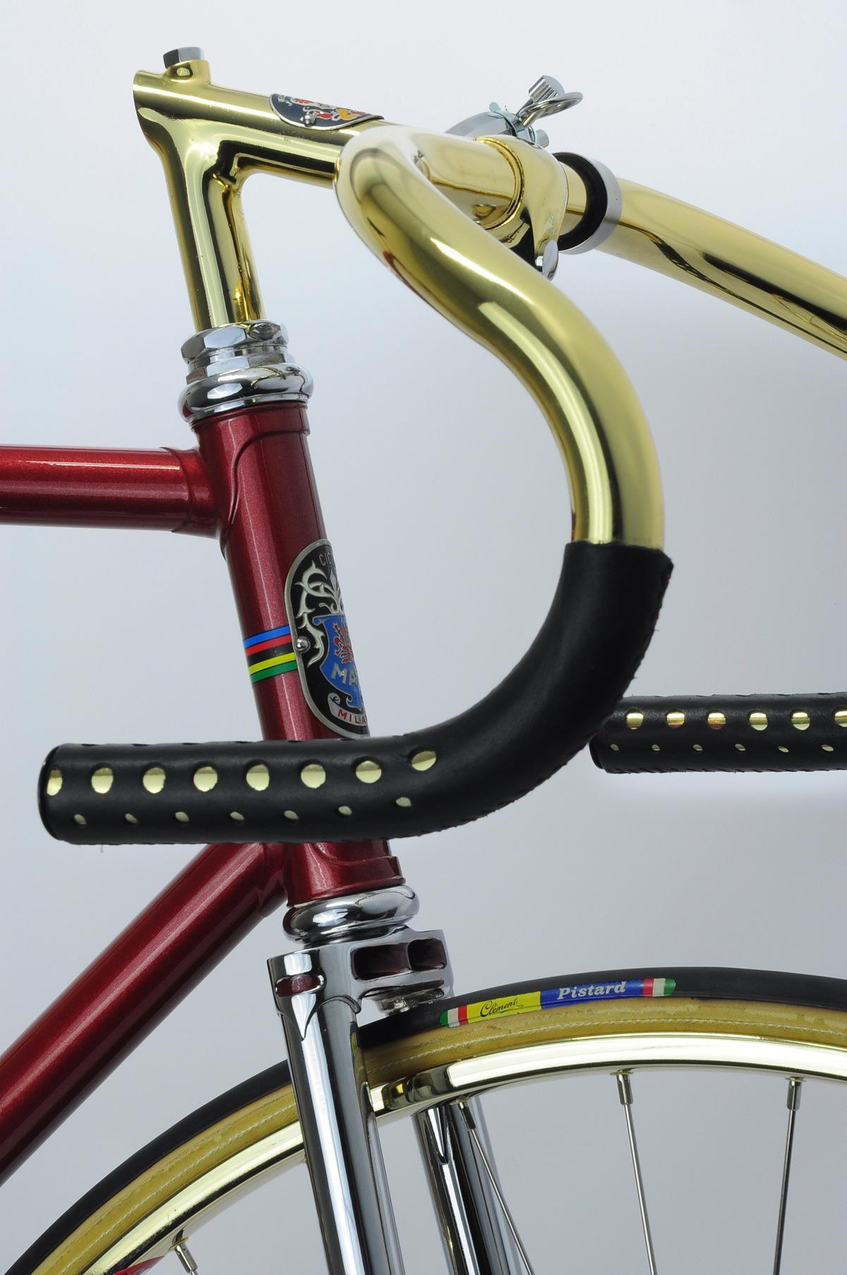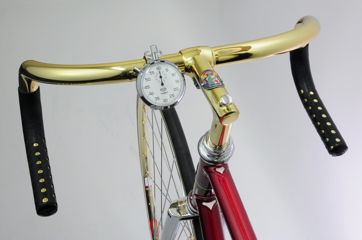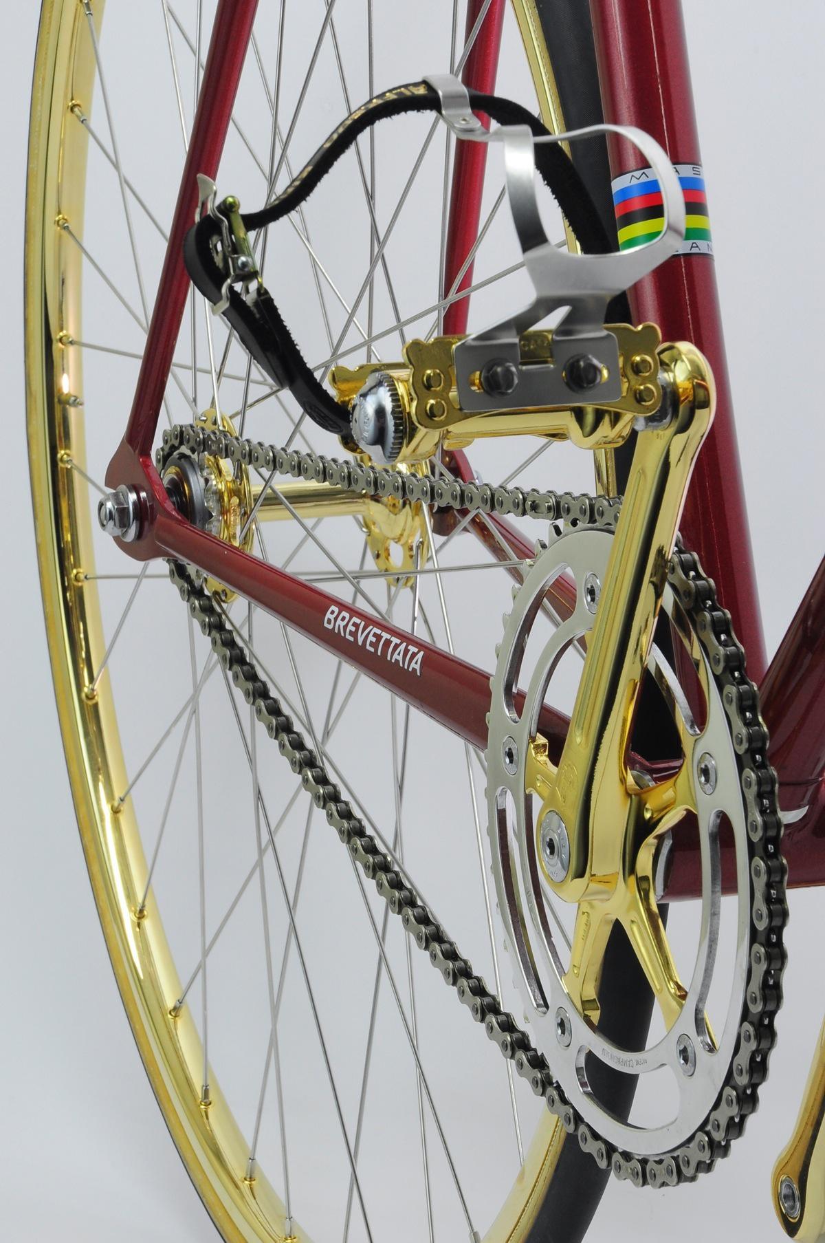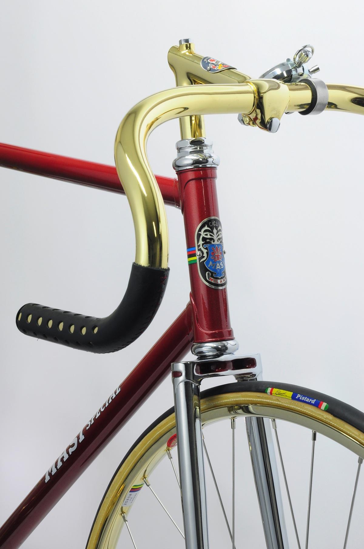 Biciclette vintage di lusso: Masi Special Matteo Ganassali 2 Gennaio 2015 Bike News Dopo la Cioccgold e le due Colnago, siamo lieti di presentarvi in esclusiva un’altra storica bici creata da sapienti mani italiane e passata tra le grinfie dello spagnolo di León. Questa volta non un modello strada ma un pista che farà sbavare molti patiti “fissati” attuali. È stata appena finita e lucidata, pronta per il passaggio sotto i riflettori, che le spetta di diritto! È bello notare che in questo caso, come nelle altre due bici, l’oro 24k non rende la bici una pacchianata ma si integra bene nel contesto, anche estetico, evidenziando l’eccellenza che la bici rappresenta. Dal prossimo weekend su eBay a un prezzo interessante! Anche se queste bici, per i valori che rappresentano, possono valere anche di più per chi le compra… Da segnalare che questa MASI ha avuto un importante precedente proprietario, il professionista Vicente Lopez Carril, dal cui leggendario negozio di Gijon (purtroppo chiuso questa estate) proviene. FALIERO MASI anni ’70, 54,5 cm c-c. Forcella con nuove cromature e telaio riverniciato con nuove decals e badge originale. Montatata completamente Campagnolo Record con placcature oro 24k. Guarnitura Pista 165 mm / 50 x 14 Mozzi 36 fori Reggisella 27,2 cm Sella Cinelli Unicanitor NOS in plastica perforata da Javiér Stem Cinelli Pista Straps Alfredo Binda NOS con i vecchi caratteri Cerchi Super Champions NOS Tubolari Clement Pistard NOS Cronometro Hever