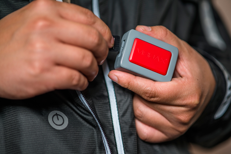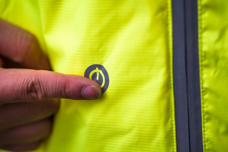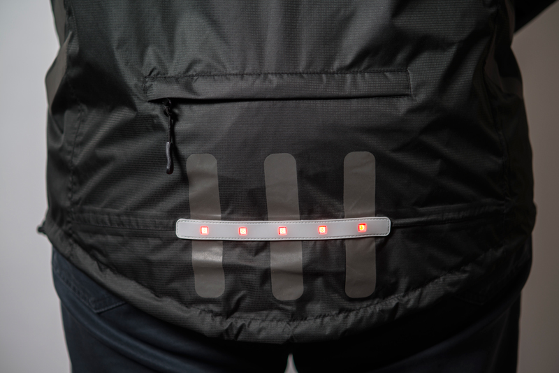 Sulla giacca troviamo in totale 23 LED, sia anteriori che posteriori (ovviamente gli anteriori bianchi ed i posteriori rossi) la cui posizione è stata studiata in modo da non interferire con lo zaino. Il tutto è collegato a una piccola batteria al litio staccabile e ricaricabile via USB, dalla durata indicativa di circa 30 ore.