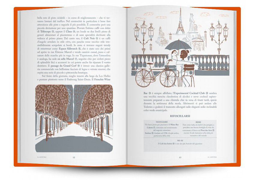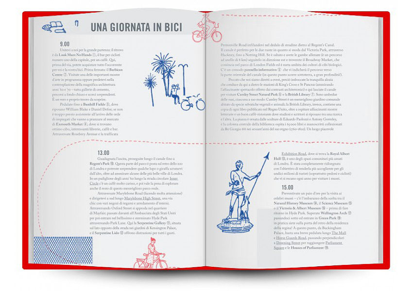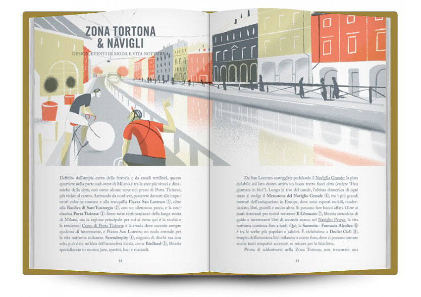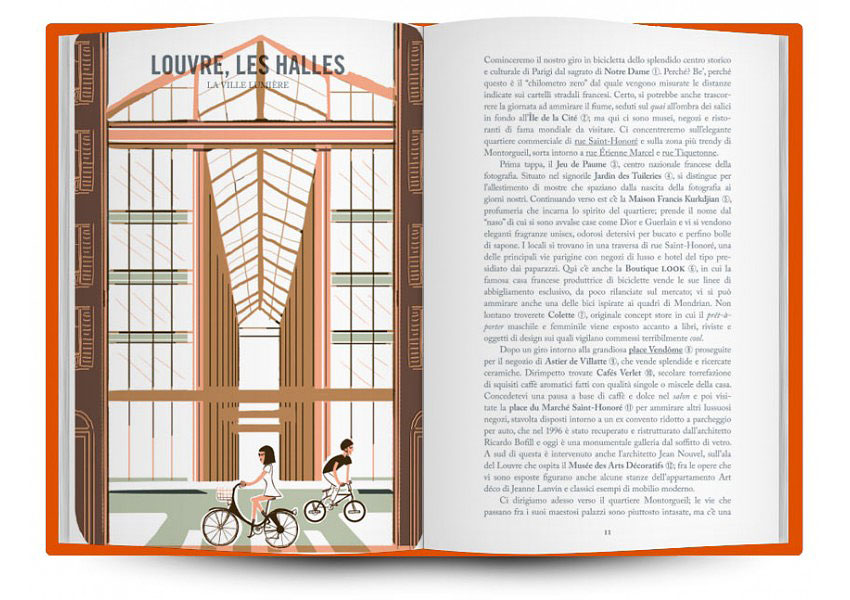 Le guide sono pensate e confezionate per i ciclisti, con il loro comodo formato tascabile che le rende consultabili in sella. E, per di più, sono decisamente chic, con una grafica interna molto retrò che richiama le forme geometriche tipiche dei primi del Novecento, epoca d’oro per la bicicletta.