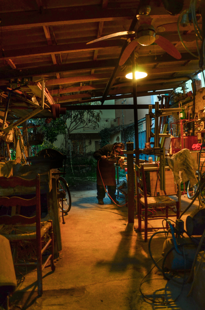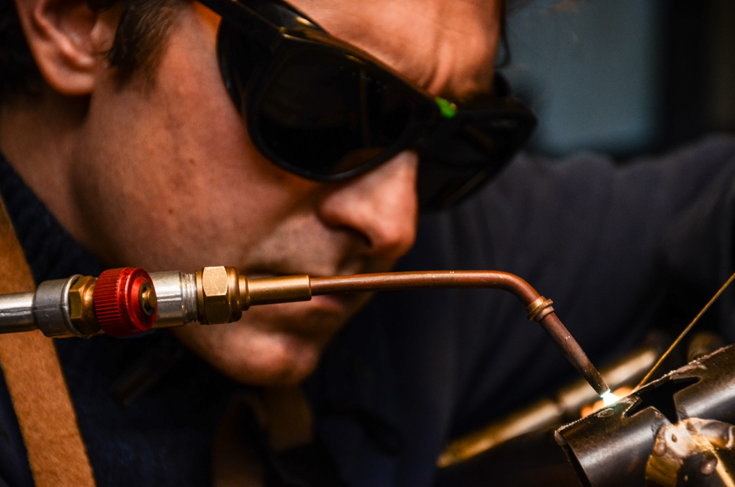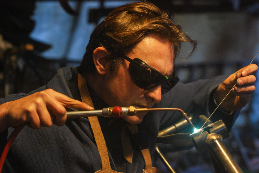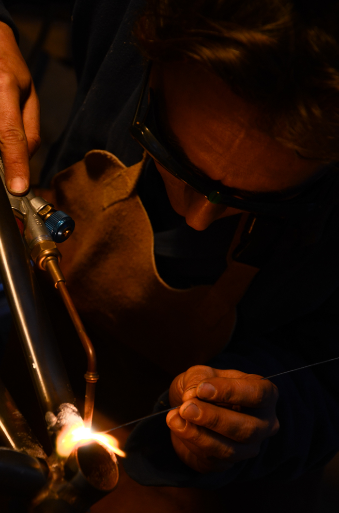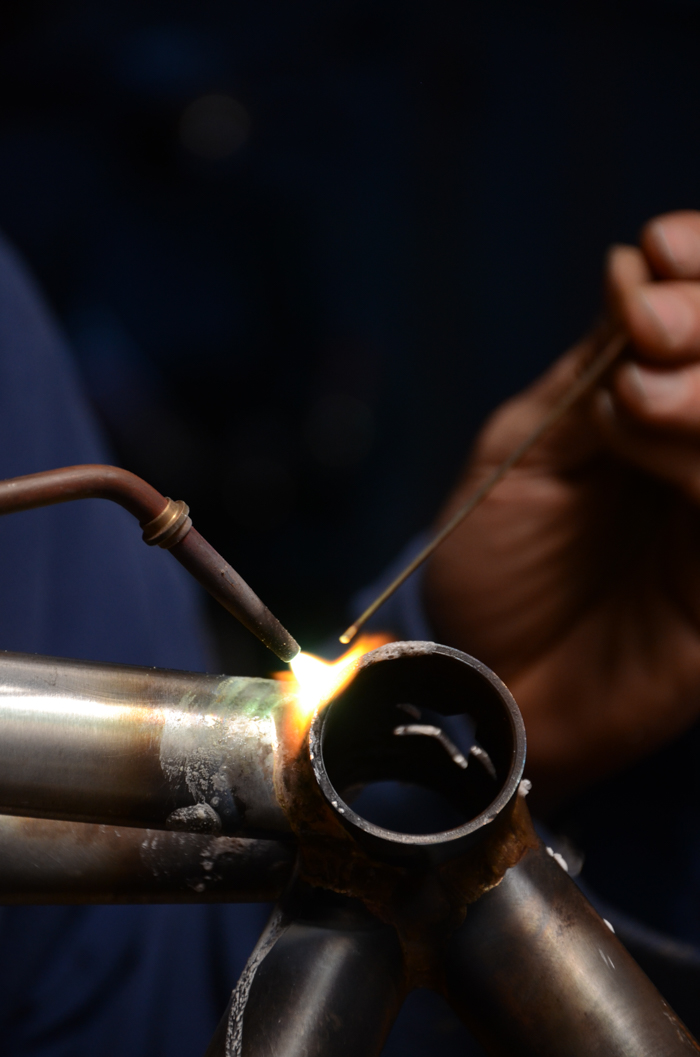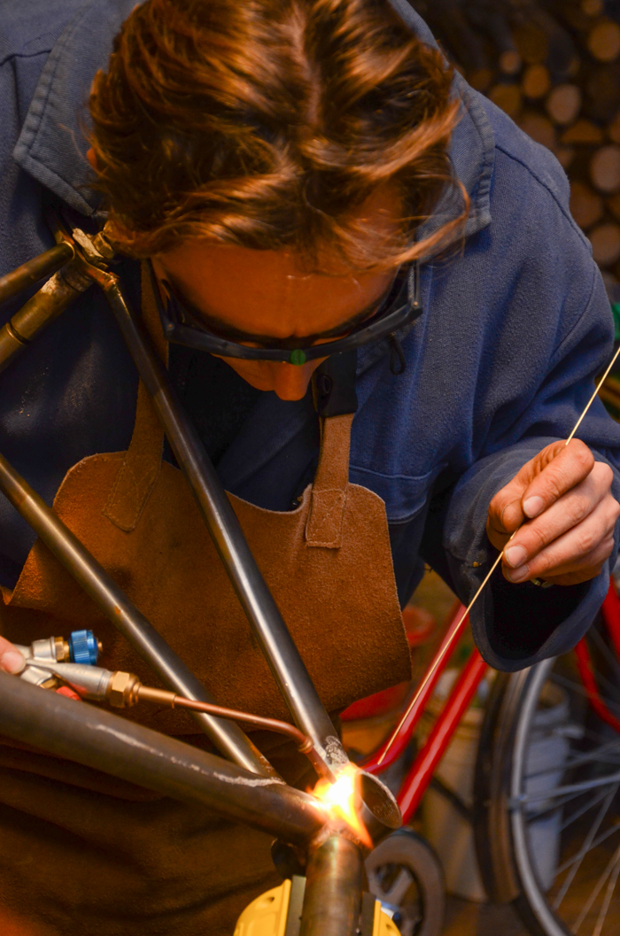 Giovanni mentre usa il saldatore su un futuro telaio di bicicletta