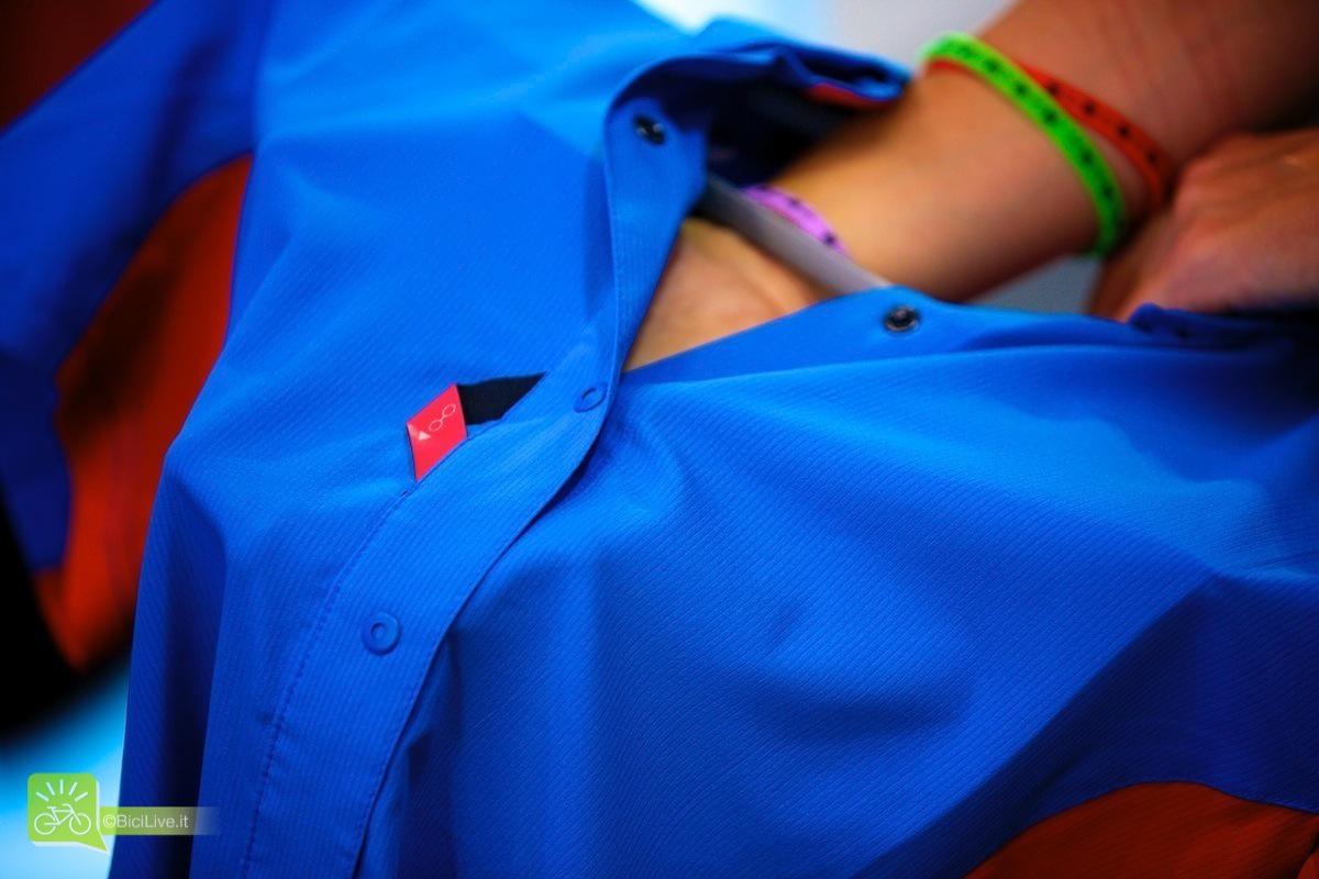 Tutte le maglie Shimano donna hanno particolari che si confondono con il design come il nastrino porta occhiali vicino allo scollo o la mini tasca porta telefono sul dorso.