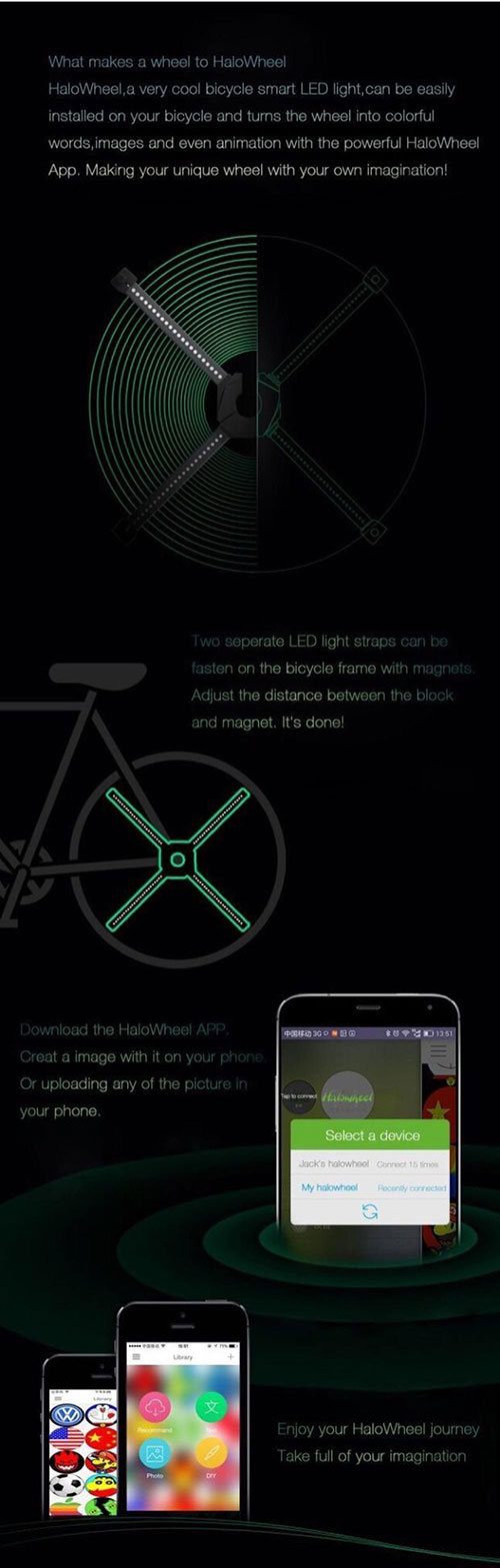 HaloWheel: figure e loghi luminosi sulle ruote delle vostre biciclette Elvezio Sciallis 15 Dicembre 2015 Anteprime HaloWheel vi permette di trasformare le ruote della bicicletta in veri e propri schermi luminosi attraverso l’utilizzo di led molto facili da montare, schermi sui quali potrete poi programmare ogni tipo di immagine fissa o in loop grazie a una app L’idea è geniale nella sua semplicità e si presta a molti impieghi che possono interessare sia i singoli che le ditte, i negozi e, perché no, anche il settore pubblico, senza dimenticare la sua estrema efficacia quale sistema di illuminazione della propria bici. HaloWheel è nato da tre studenti della University of Electronic Science and Technology of China e viene distribuito in Italia da Bike4Light, azienda leader in Italia per l’applicazione della tecnologia delle luci led alle biciclette. Abbiamo già avuto modo di parlarvi in precedenza di alcuni degli ottimi accessori proposti da Bike4Light (visto il periodo ve li consigliamo come regali di Natale molto utili) e testare la pettorina led Backrest, cerchiamo ora di capire come funziona e quali scopi può avere HaloWheel. HaloWheel è un sistema composto da due strisce di led che si applicano sui raggi di ogni tipo di ruota (26” o superiore) tramite dei morsetti regolabili e un magnete che si fissa sulla forcella tramite una piccola cinghia. L’operazione, come si può notare anche dal filmato, richiede pochi secondi e da quel momento le ruote della vostra bicicletta sono pronte per diventare veri e propri schermi luminosi. E se le strisce led sono il cuore pulsante di HaloWheel, ecco che l’app dedicata (disponibile per Android e IOS) ne è il cervello pensante: il vostro cellulare diventerà quindi la centrale di comando attraverso la quale decidere che immagini creare sulle ruote. C’è estrema libertà di scelta in quanto è possibile sia impiegare le immagini già presenti nella libreria che scaricarne di nuove e addirittura crearne di uniche e personali, così come è possibile programmare un loop di immagini in una sorta di animazione. A questo punto l’unico limite diventa l’immaginazione del singolo ciclista ma, prima di andare a scoprire i possibili impieghi di HaloWheel, qualche dettaglio tecnico. Le strisce sono impermeabili e antiurto, di colore nero, misurano 51x7x2,8 centimetri per un peso di 260 grammi, le batterie durano fino a 15 ore e servono poi 4 ore per la ricarica e l’immagine è distinguibile all’interno di un intervallo di velocità compreso fra gli 8 e 60 chilometri orari. L’app vi permette di caricare i disegni o foto di preferenza (testi compresi), modificarli come vi pare e memorizzarli in libreria pronti per futuri usi: potrete anche modificare alcuni parametri quali grandezza del cerchio, angolazione del disegno, intervallo del loop o gestione differenziata sulle due ruote. In aggiunta, l’app vi permetterà di controllare alcuni dei più classici parametri di guida quali chilometraggio, velocità, pedalata, livello batterie e altro ancora. Il primo utilizzo è ovviamente quello ludico: avere due ruote in grado di diventare schermi sui quali proietterete quel che vi pare è molto, molto divertente e oltre a servire come diletto personale può far faville durante delle feste, incontri o manifestazioni in quanto sarà impossibile non notarvi sulla vostra bicicletta. Ma la possibilità di caricare immagini e testo apre la via a molti impieghi pubblicitari che, per una frazione delle consuete spese di marketing, vi permetterà di ottenere risultati ben migliori. Dei messaggi luminosi su ruota si notano molto di più di un semplice poster o manifesto che si confondono fra mille altri e, oltre a essere utile a negozi e aziende, HaloWheel è ancora più adatto ed efficace nel fare pubblicità a eventi, fiere, concerti e congressi di vario tipo: quattro o cinque ciclisti che girano in gruppo propagandando il tutto con immagini luminose nelle vie della città hanno di sicuro un grande impatto. Immagini, testi e gif animate aspettano solo la vostra fantasia per diventare vivi e luminosi sulle ruote delle vostre biciclette: consultate la pagina che Bike4Light dedica a HaloWheel per scoprirne tutte le potenzialità.