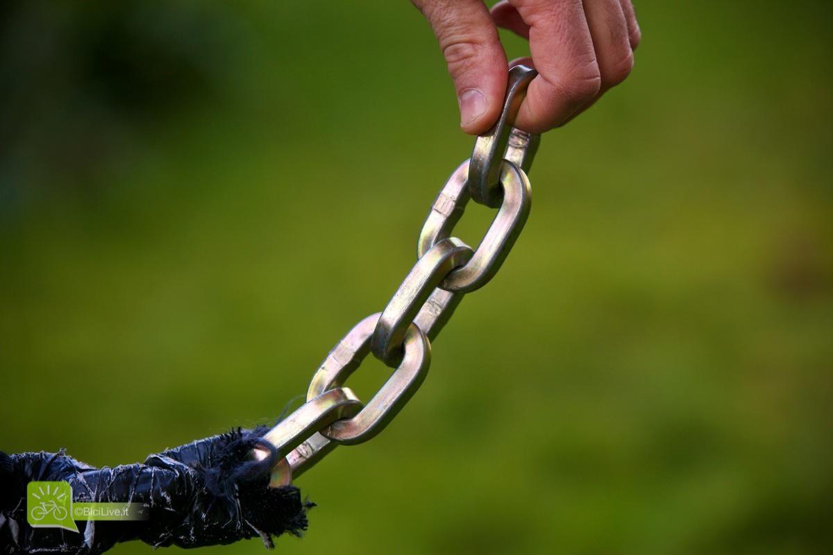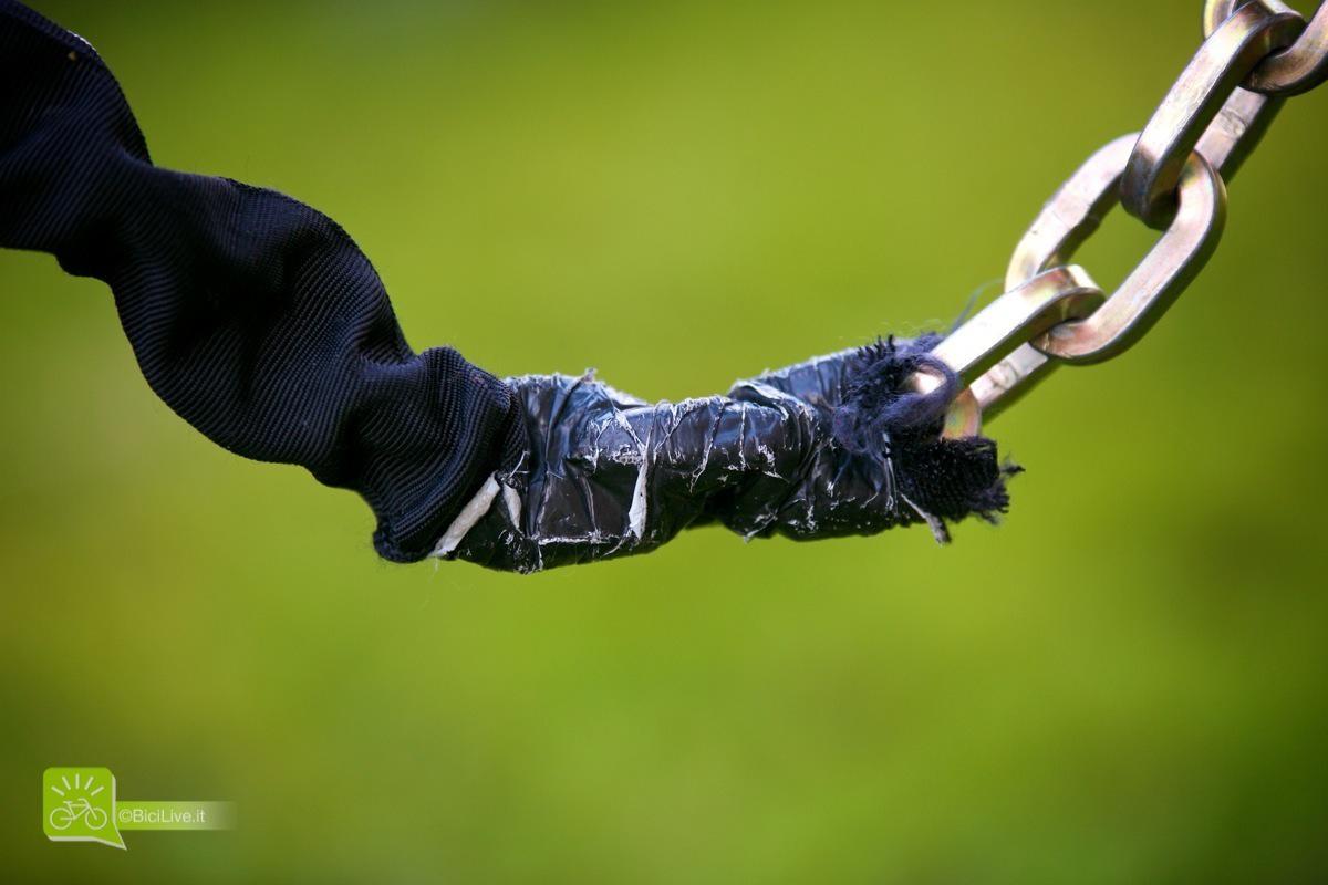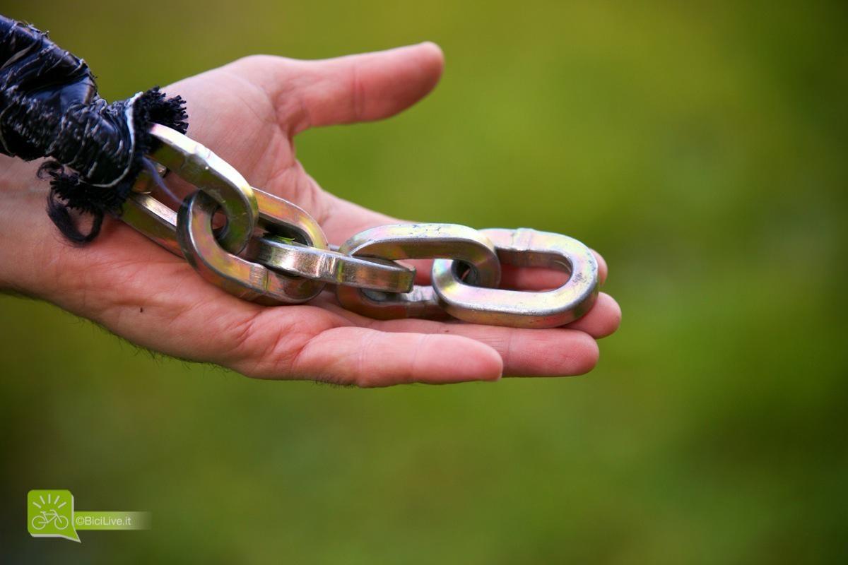 Kryptonite New York Chain Aldo Reynaudo 30 Gennaio 2014 Test Il Kryptonite New York Chain è un catenone gigantesco pensato per sopravvivere ai ladri della città di New York City. E’ decisamente imponente e (purtroppo) pesantissima, la versione con catena lunga un metro completa di lucchetto pesa la bellezza di 3.92kg! Decisamente impressionante, ma è poi così sicura? “L’anello debole” Spero di sì visto che la uso quotidianamente, ma devo ammettere che ha i suoi difetti. Se la paragoniamo all’Evolution Mini sempre di Kryptonite, notiamo che l’arco sul lucchetto è di dimensioni compatibili, mentre il meccanismo di chiusura è migliore, il che sarebbe la valida spiegazione del perché sul sito ufficiale Kryptonite indichino una sicurezza di 9 su 10 per la il NewYork e di solo 7 su 10 per il Mini U lock. L’anello debole della catena sono però, appunto, gli anelli. Essi sono di diametro nettamente inferiore e di materiale più tenero, quindi molto più facili da tagliare. Se aggiungiamo che la catena è più flessibile e può facilmente essere posizionata da un ladro per un taglio più comodo (ad esempio a terra per facilitare la pressione delle tenaglie ndr) arriviamo alla conclusione che non è poi così sicura come sembra. Personalmente adoro questa catena perché permette di legare qualunque bici, con qualunque telaio a qualunque cosa, senza impazzire a cercare pali di particolari dimensioni o ancora peggio non poter usare una mtb perché le ruote non passano nell’arco dell’U lock. Visto il peso è pratica comune portare questa o altre catene similari legate in vita. In effetti è molto comodo e “fa molto New York bike messenger”, ma può risultare anche piuttosto pericoloso, in caso di caduta tutto il metallo è a contatto con le ossa del bacino e potrebbe causare non pochi danni. Inoltre mai e poi mai chiudere la catena in vita utilizzando il lucchetto, sembra comodo, ma è impossibile regolare la larghezza, e con un metro di catena se non siete dei ciccioni scivola via, ma soprattutto in caso di incidente potrebbe essere problematico togliervela di dosso. Molto meglio usare un moschettone da arrampicata, si può regolare la larghezza della improvvisata cintura e soprattutto chiunque, se necessario, può agevolmente rimuovere la catena. Consiglio Legate sempre la bici facendo in modo che la catena rimanga il più possibile sollevata da terra, un lucchetto appoggiato al suolo è molto facile da frantumare con un martello.