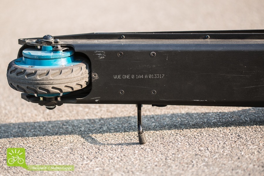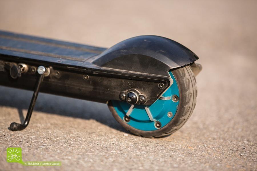 La batteria trova sede nella pedana mentre il motore è integrato nella ruota posteriore. È dotato di un freno che, quando viene azionato, ricarica la batteria.