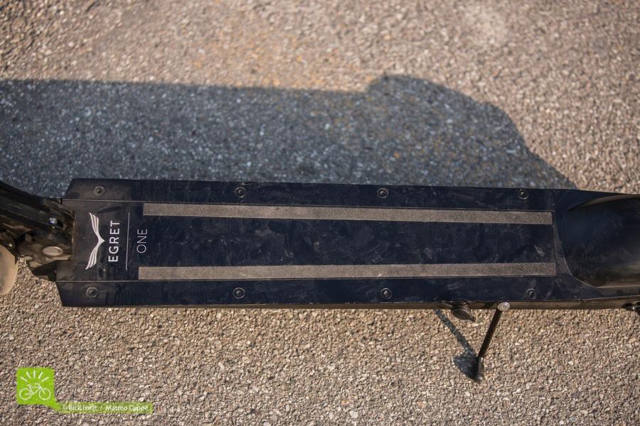L’Egret One ha le sembianze di un monopattino tradizionale, possedendo una pedana di appoggio robusta e resistente. Tutto il corpo dell’Egret One è realizzato con una lega di alluminio utilizzata anche nel settore aeronautico per mantenere una maggior leggerezza, pur non pesando poco; 15 kg per un mezzo del genere possono essere impegnativi, soprattutto se penso a una ragazza che deve portarlo in metropolitana o al 4° piano senza ascensore (per darvi un’idea, 15 kg corrispondono a 10 bottiglie d’acqua da 1,5 litri, cioè quasi due casse d’acqua).
