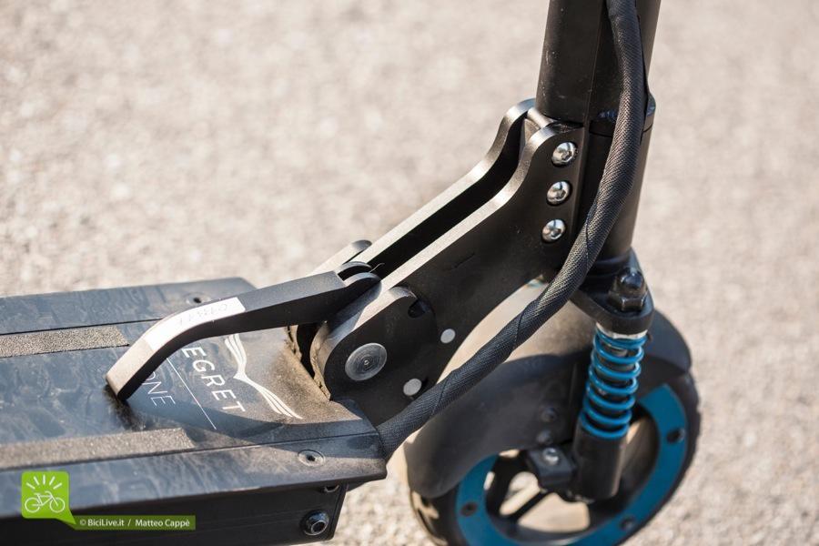Dal manubrio ai meccanismi per ripiegarlo, l’Egret One è curato in ogni minimo dettaglio: dall’inserto per migliorare il grip sulla leva del freno all’impermeabilità (ad esempio quando si attraversa una pozza d’acqua o l’asfalto dopo un acquazzone): non è progettato per l’utilizzo sotto la pioggia ma resiste agli schizzi.
