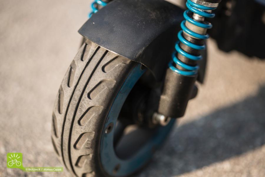 Comunque sono stato scrupoloso e ho trovato un aspetto non convincente al 100%: la ruota anteriore è affidata a un sistema ammortizzante, una sorta di forcella ammortizzata molto scarna e ridotta nelle dimensioni. Durante il test, spesso il sistema è andato a fondo corsa (ciò significa che le molle si comprimono completamente) e questo si traduce in un feeling di guida poco piacevole. Sono dell’idea che la sospensione anteriore debba subire un upgrade. La ritengo sufficiente ma non al pari del resto dei componenti del monopattino.