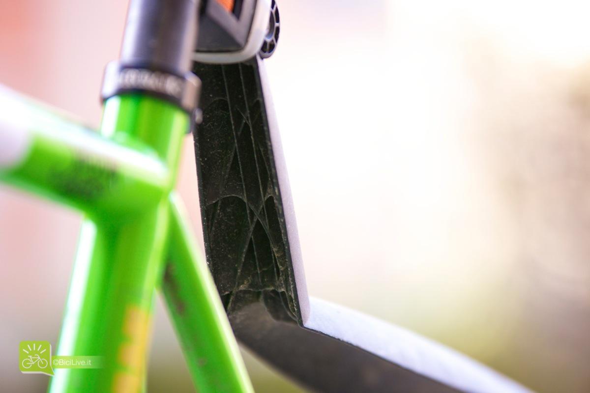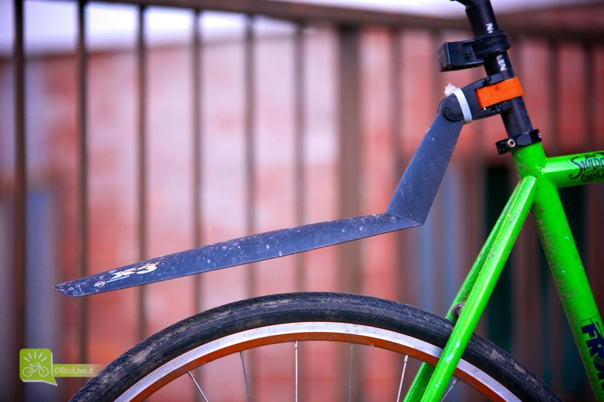 Test parafanghi amovibili per bici SKS: X-Tra-Dry e Mud-X Aldo Reynaudo 4 Febbraio 2014 Test I parafanghi sono un elemento indispensabile per la bici urbana. Esistono molti modelli di bici predisposte e vendute con questi utili accessori di serie. Ma chi possiede una bici senza predisposizione per i parafanghi o vuole acquistarne una può montare dei parafanghi molto comodi da installare all’occorrenza. Ho testato per un lungo periodo i modelli del brand Sks, Mud-X e X-Tra-Dry. Sono una coppia (anteriore e posteriore) di parafanghi in materiale plastico, acquistabili anche singolarmente, che si possono montare con estrema facilità sul tubo obliquo del telaio e sul reggisella per ripararsi da schizzi d’acque e fango. Il sistema di aggancio è molto semplice e veloce, l’inclinazione del posteriore è variabile per poterla meglio adattare al tipo di telaio, al diametro delle ruote ed all’altezza a cui viene montato sul reggisella. Ho questa coppia di parafanghi ormai da anni e non posso che esserne soddisfatto. Nonostante la mia necessità fosse quella di montarli su una bici con copertoncini 700x23c da strada, ho optato per un modello da mtb. Mi è piaciuta l’idea di avere un parafango più largo e più “protettivo”, oltretutto il telaio su cui li avrei montati era in tubi alluminio oversize e l’obliquo era addirittura più largo del parafango anteriore che sarebbe stato quindi del tutto inutile. La cosa che per me è più interessante è la possibilità di montarli e smontarli a seconda delle esigenze. Ho però, purtroppo, scoperto che questa non è la soluzione ideale. Con la scusa che “tanto ci vuole un attimo a montarli” si finisce di non montarli mai; per poi, dopo essere usciti col sole, trovarsi a rientrare sotto l’acqua senza questi utili accessori. Così un anno e mezzo fa ho deciso di sostituire i lacci elastici dell’anteriore MUD-X con fascette da elettricista e ne ho usato una terza per fissare la cinghia all’X-TRA-DRY posteriore. Anche montati in modo permanente non danno alcun fastidio, pesano pochissimo e sono sempre lì in caso di bisogno. Le fascette fisse inoltre fanno perder tempo ad eventuali “ladri di parafanghi”, si sa che “l’occasione fa l’uomo ladro” e se lasciamo i parafanghi fissati solo con degli elastici, qualcuno potrebbe rubarli in pochissimi secondi, mentre con le fascette almeno gli rendiamo la vita un po’ più difficile. Alcuni difetti Il Mud-X rischia a lungo termine di rovinare leggermente la vernice sul tubo obliquo, fissato con i lacci di serie comunque vibra leggermente e la plastica dura striscia sul telaio, si risolve facilmente apponendo una striscia di nastro adesivo sul telaio in corrispondenza dei punti di contatto. L’unica “pecca” dell’X-Tra-Dry è, invece, che su reggisella corti rimane poco spazio per montare eventuali luci posteriori. Insomma, veramente due inezie, per una coppia di prodotti utilissimi e praticamente indistruttibili in grado, con un prezzo veramente irrisorio, di cambiare il vostro modo di usare la bici sotto la pioggia o dopo un acquazzone.