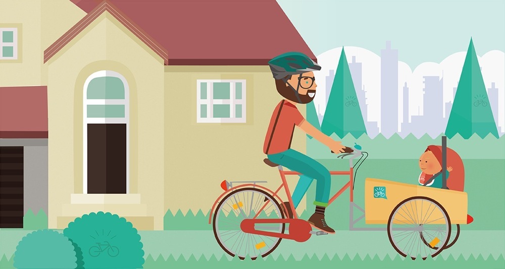 L'immagine mostra due genitori che hanno finalmente trovato la soluzione di trasportare il figlio di pochi mesi di vita in bici con il seggiolino da auto.