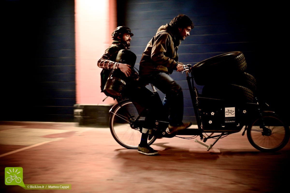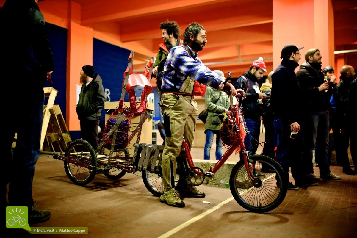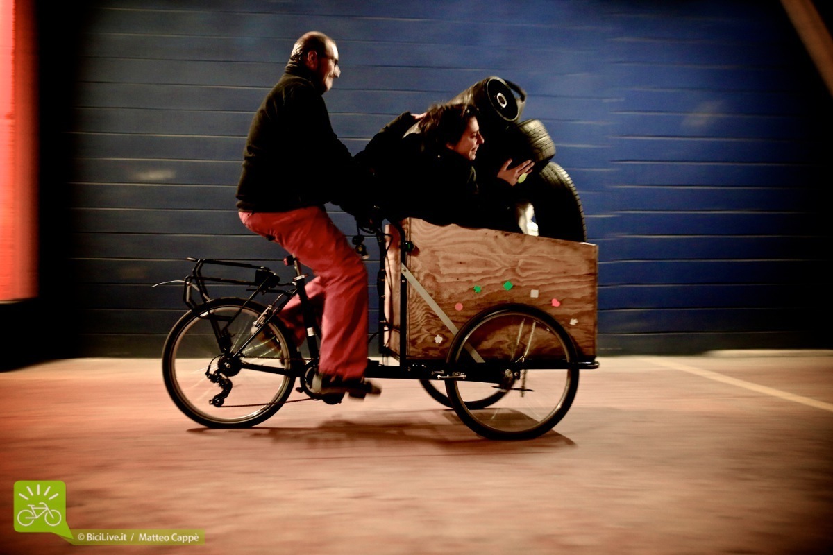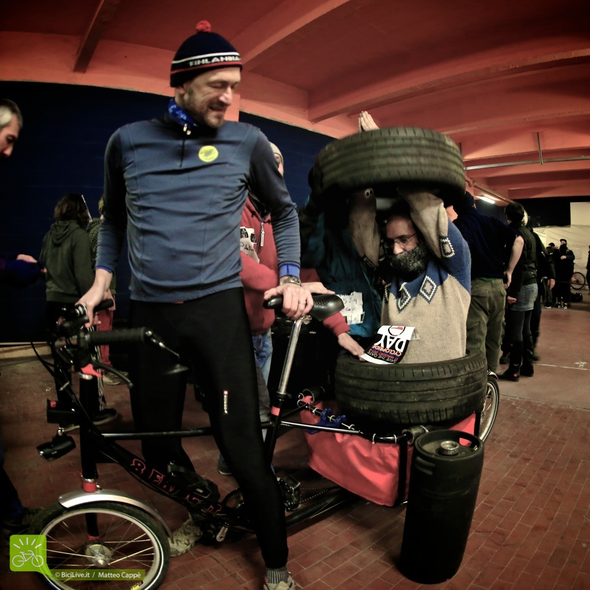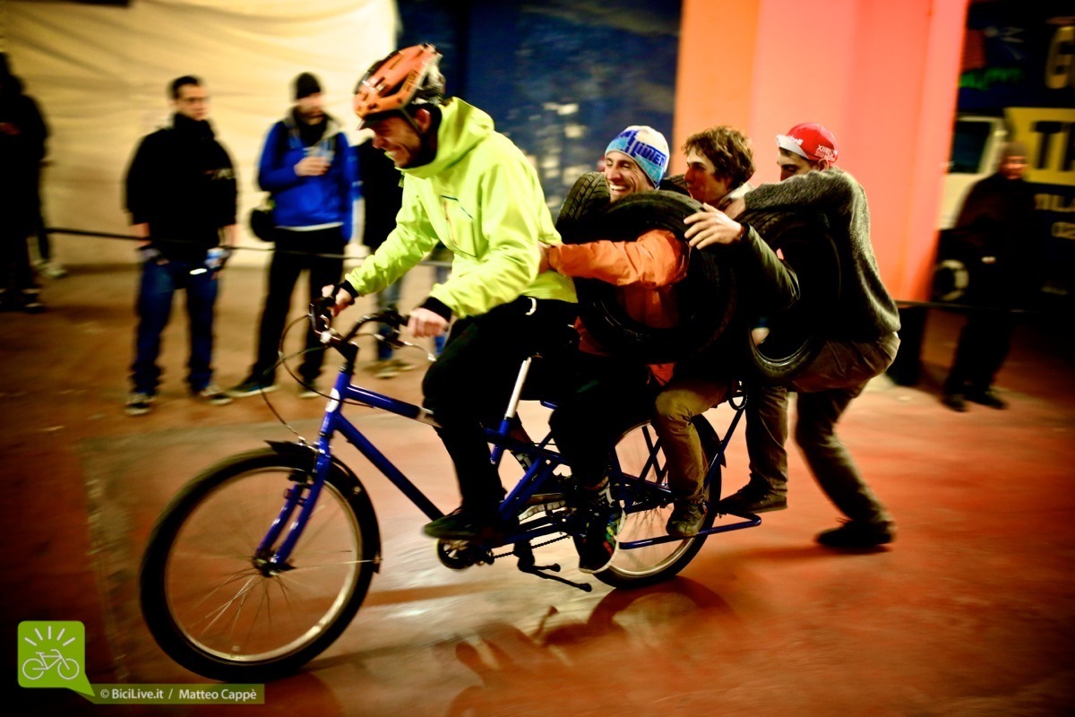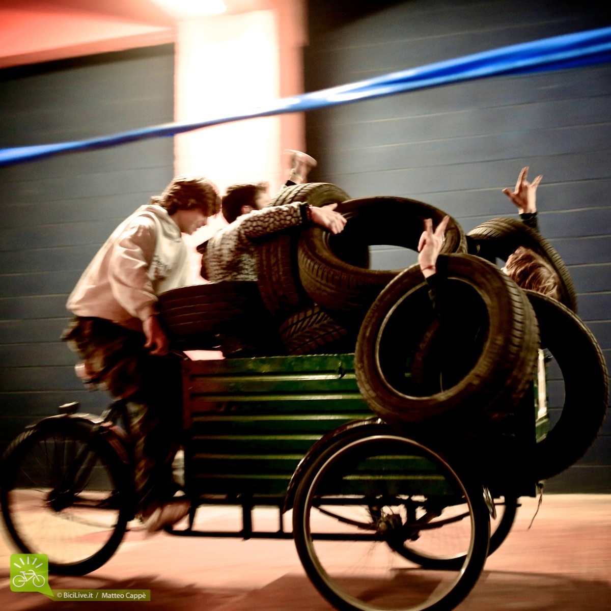 La gara delle bici da carico: Wacky Cargo Race! Matteo Cappè 16 Dicembre 2013 Bike News L’atmosfera era eclettica, ciclisti-urbani-da-soma riuniti per sfidarsi con i loro mezzi Persone e fusti di birra incastrati dentro a pile di pneumatici usati, mani, piedi e braccia che si dimenano, mezzi da gara dei più bizzarri… Sembra il Wacky Race, no anzi, la descrizione di un carico di clandestini stivati in un tir, ma invece è la Cargo Race che si è svolta durante il BFF di Milano ieri pomeriggio nei seminterrati della location di Via Ventura 15. L’atmosfera era eclettica, ciclisti-urbani-da-soma riuniti per sfidarsi con i loro mezzi, quelli che di solito passano quasi inosservati e raramente si vedono in giro, si sono riuniti tutti in questo seminterrato di un vecchio capannone industriale. Ma non c’erano solo bici cargo di ogni tipo, c’era una banda che suonava, lo spillatore per la birra naturalmente trasportato su bici cargo, vin brulè nelle mani di ognuno e un bel numero di spettatori. La Cargo Race si corre a manche di due concorrenti alla volta, definiti A e B; la gara consiste nel riuscire a trasportare più carico possibile, l’unità di misura? Pneumatici. Sì, gomme usate. Ma nelle foto avete già visto delle persone caricate in mezzo alle gomme e pure dei fusti di birra… Ecco, anche le persone e i fusti vengono convertiti in gomme… In che senso? Allora, 30Kg equivale ad una gomma, una persona come Ale, che pesa ad esempio 80kg, si converte in 2,5 gomme! 3 fusti di birra equivalgono a una gomma. Ritornando alla gara, i due concorrenti partono… No, attenzione, partono quando la banda inizia a suonare, poi si dirigono subito all’area di “carico” in cui ci sono le due zone, A e B. Il concorrente A cerca di caricarsi il più possibile e poi deve fare un giro del percorso di gara, che si sviluppa nel seminterrato, tra pilastri di cemento arancioni e mura di mattoni colorate di un blu oltremare. Concluso il giro si ritorna alla zona di carico e scarico… Quando finisce la manche? Naturalmente quando la banda smette di suonare! Se devo dire la verità, da esterno, il tutto sembrava caotico e disorganizzato, ma credo invece che ci fosse della logica e tanta passione in tutta questa pazzesca competizione. Quello che invece mi ha stupito di più è stata l’atmosfera impregnata di genuinità e purezza legata a un solo trait d’union: la passione di tutte le persone presenti per la bicicletta, in tutte le sue forme, anche quelle più bizzarre. Guardatevi la gallery!