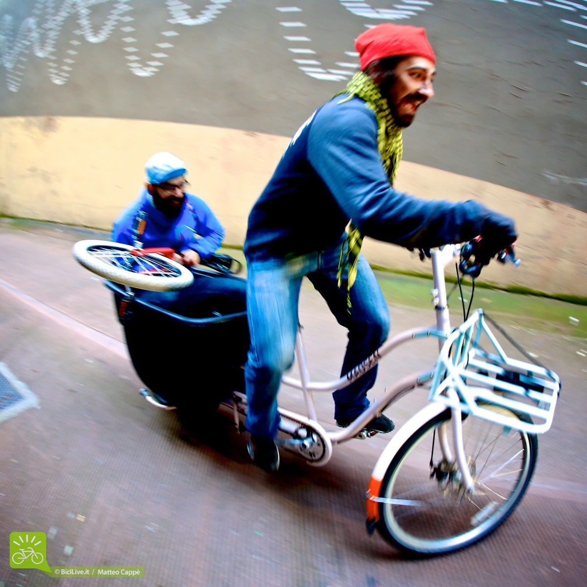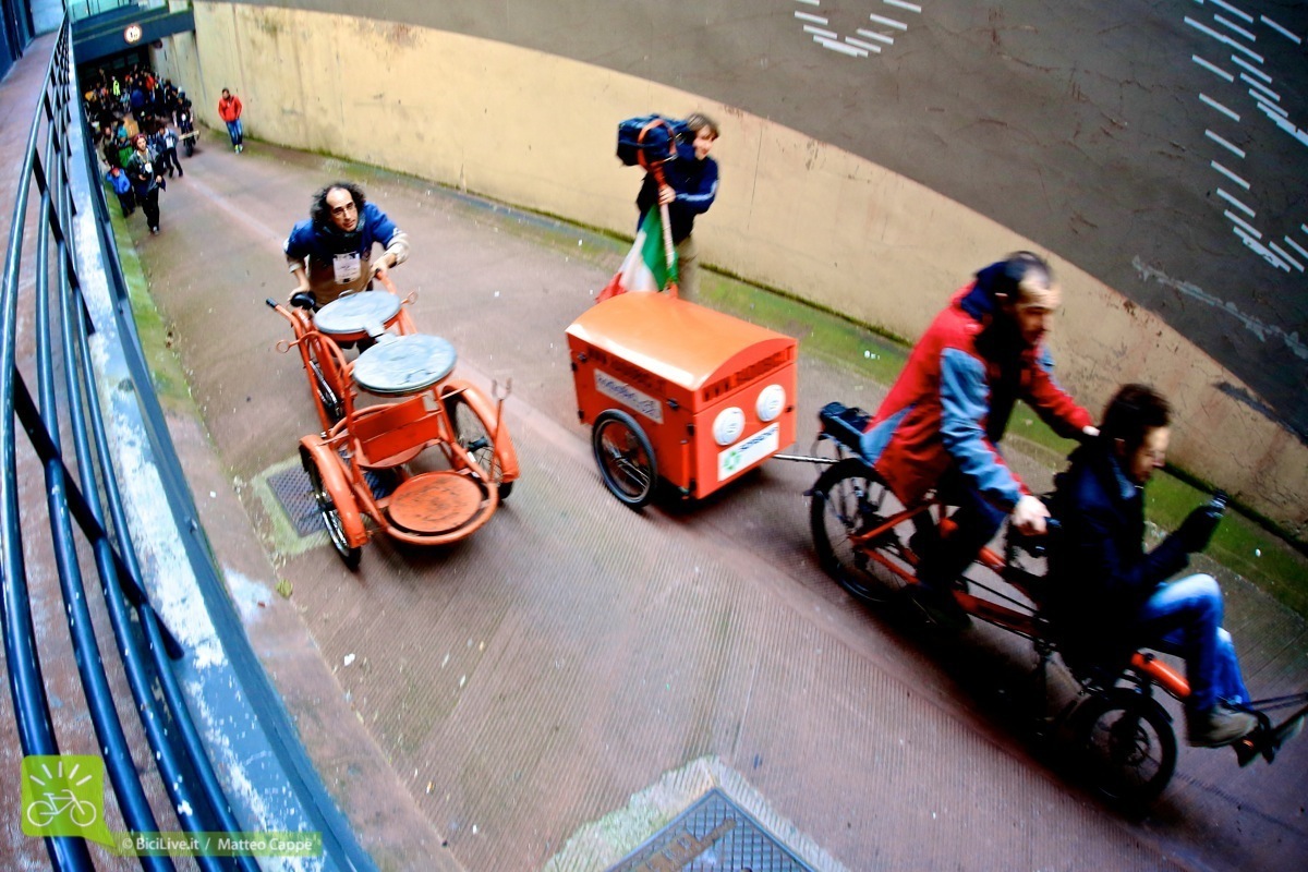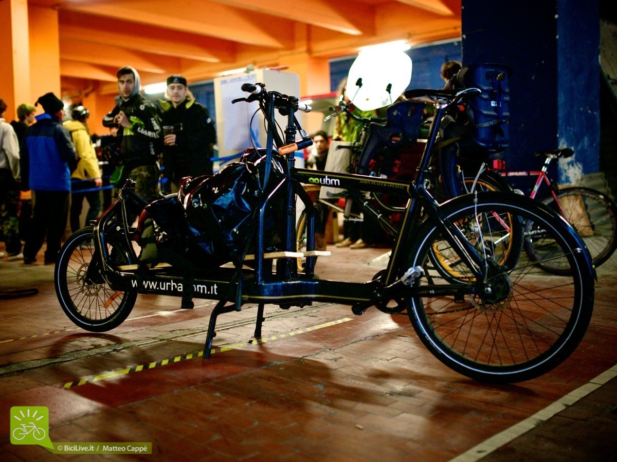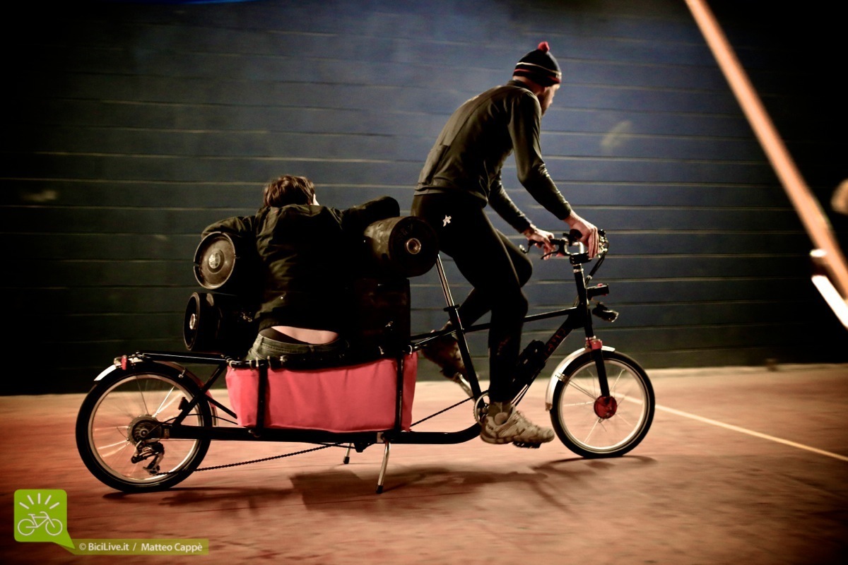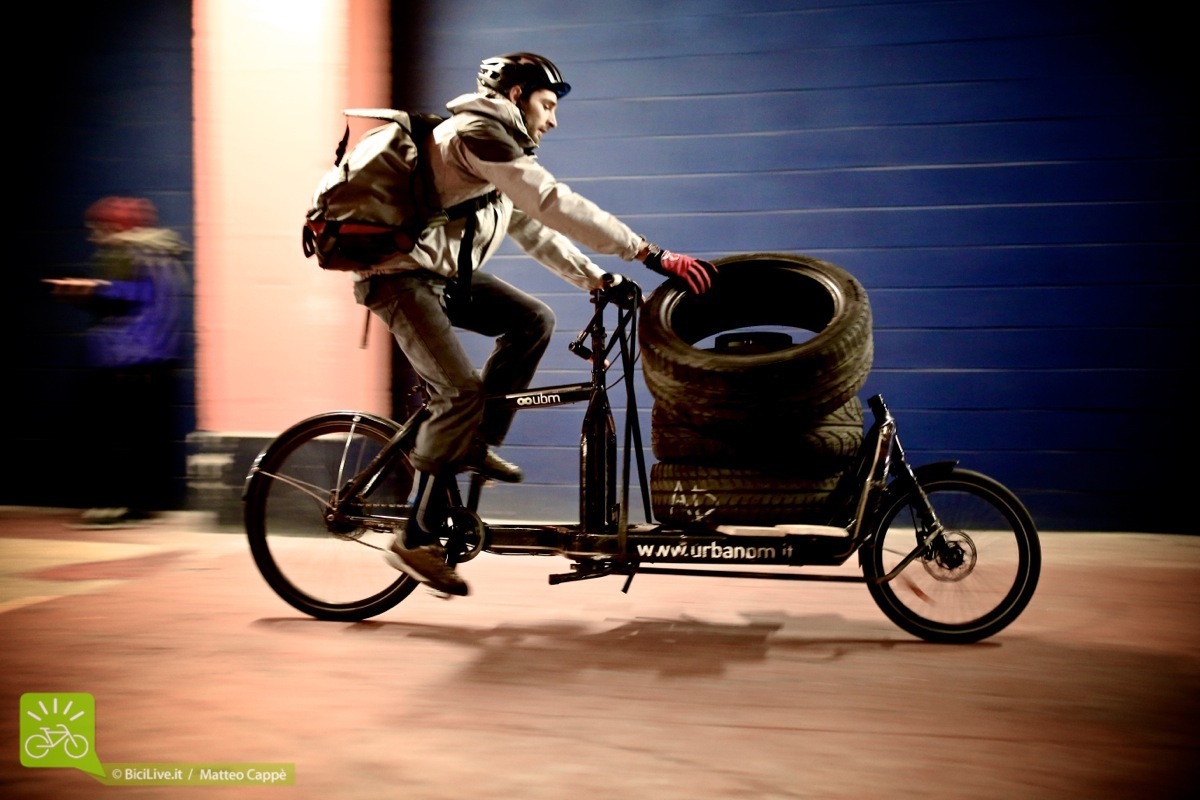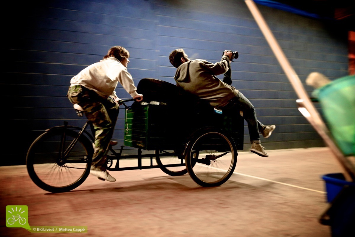 La gara delle bici da carico: Wacky Cargo Race! Matteo Cappè 16 Dicembre 2013 Bike News L’atmosfera era eclettica, ciclisti-urbani-da-soma riuniti per sfidarsi con i loro mezzi Persone e fusti di birra incastrati dentro a pile di pneumatici usati, mani, piedi e braccia che si dimenano, mezzi da gara dei più bizzarri… Sembra il Wacky Race, no anzi, la descrizione di un carico di clandestini stivati in un tir, ma invece è la Cargo Race che si è svolta durante il BFF di Milano ieri pomeriggio nei seminterrati della location di Via Ventura 15. L’atmosfera era eclettica, ciclisti-urbani-da-soma riuniti per sfidarsi con i loro mezzi, quelli che di solito passano quasi inosservati e raramente si vedono in giro, si sono riuniti tutti in questo seminterrato di un vecchio capannone industriale. Ma non c’erano solo bici cargo di ogni tipo, c’era una banda che suonava, lo spillatore per la birra naturalmente trasportato su bici cargo, vin brulè nelle mani di ognuno e un bel numero di spettatori. La Cargo Race si corre a manche di due concorrenti alla volta, definiti A e B; la gara consiste nel riuscire a trasportare più carico possibile, l’unità di misura? Pneumatici. Sì, gomme usate. Ma nelle foto avete già visto delle persone caricate in mezzo alle gomme e pure dei fusti di birra… Ecco, anche le persone e i fusti vengono convertiti in gomme… In che senso? Allora, 30Kg equivale ad una gomma, una persona come Ale, che pesa ad esempio 80kg, si converte in 2,5 gomme! 3 fusti di birra equivalgono a una gomma. Ritornando alla gara, i due concorrenti partono… No, attenzione, partono quando la banda inizia a suonare, poi si dirigono subito all’area di “carico” in cui ci sono le due zone, A e B. Il concorrente A cerca di caricarsi il più possibile e poi deve fare un giro del percorso di gara, che si sviluppa nel seminterrato, tra pilastri di cemento arancioni e mura di mattoni colorate di un blu oltremare. Concluso il giro si ritorna alla zona di carico e scarico… Quando finisce la manche? Naturalmente quando la banda smette di suonare! Se devo dire la verità, da esterno, il tutto sembrava caotico e disorganizzato, ma credo invece che ci fosse della logica e tanta passione in tutta questa pazzesca competizione. Quello che invece mi ha stupito di più è stata l’atmosfera impregnata di genuinità e purezza legata a un solo trait d’union: la passione di tutte le persone presenti per la bicicletta, in tutte le sue forme, anche quelle più bizzarre. Guardatevi la gallery!
