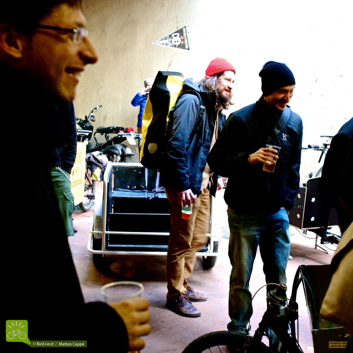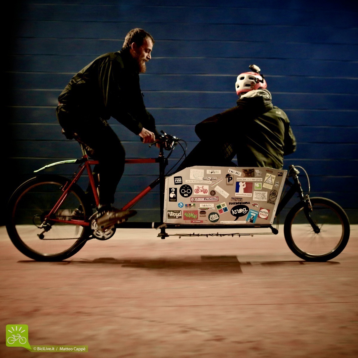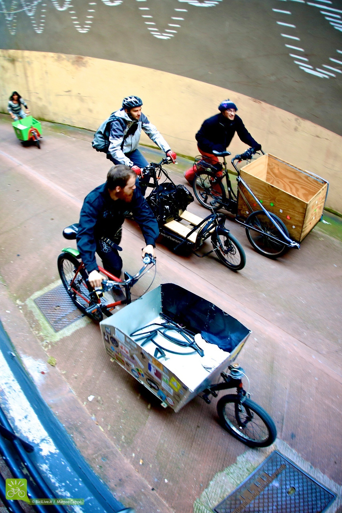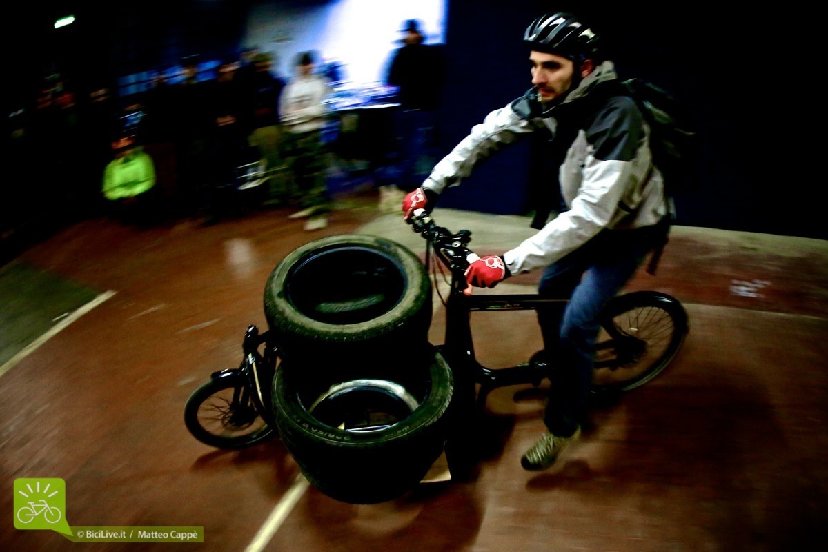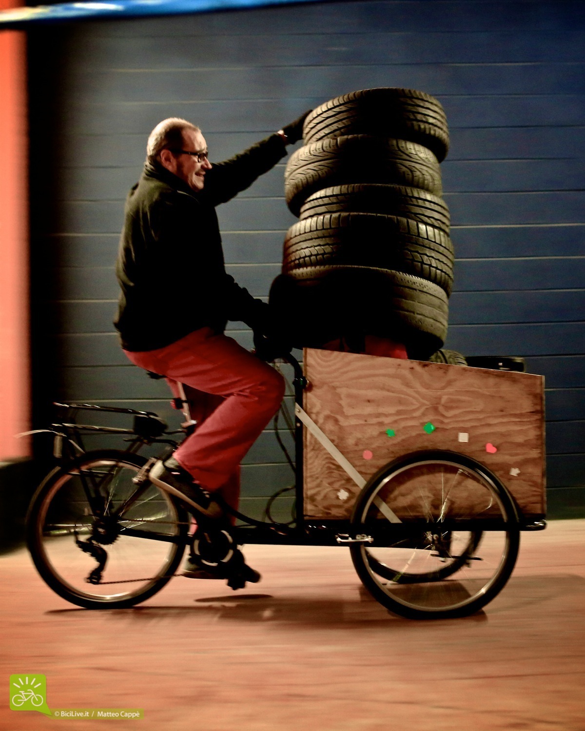 La gara delle bici da carico: Wacky Cargo Race! Matteo Cappè 16 Dicembre 2013 Bike News L’atmosfera era eclettica, ciclisti-urbani-da-soma riuniti per sfidarsi con i loro mezzi Persone e fusti di birra incastrati dentro a pile di pneumatici usati, mani, piedi e braccia che si dimenano, mezzi da gara dei più bizzarri… Sembra il Wacky Race, no anzi, la descrizione di un carico di clandestini stivati in un tir, ma invece è la Cargo Race che si è svolta durante il BFF di Milano ieri pomeriggio nei seminterrati della location di Via Ventura 15. L’atmosfera era eclettica, ciclisti-urbani-da-soma riuniti per sfidarsi con i loro mezzi, quelli che di solito passano quasi inosservati e raramente si vedono in giro, si sono riuniti tutti in questo seminterrato di un vecchio capannone industriale. Ma non c’erano solo bici cargo di ogni tipo, c’era una banda che suonava, lo spillatore per la birra naturalmente trasportato su bici cargo, vin brulè nelle mani di ognuno e un bel numero di spettatori. La Cargo Race si corre a manche di due concorrenti alla volta, definiti A e B; la gara consiste nel riuscire a trasportare più carico possibile, l’unità di misura? Pneumatici. Sì, gomme usate. Ma nelle foto avete già visto delle persone caricate in mezzo alle gomme e pure dei fusti di birra… Ecco, anche le persone e i fusti vengono convertiti in gomme… In che senso? Allora, 30Kg equivale ad una gomma, una persona come Ale, che pesa ad esempio 80kg, si converte in 2,5 gomme! 3 fusti di birra equivalgono a una gomma. Ritornando alla gara, i due concorrenti partono… No, attenzione, partono quando la banda inizia a suonare, poi si dirigono subito all’area di “carico” in cui ci sono le due zone, A e B. Il concorrente A cerca di caricarsi il più possibile e poi deve fare un giro del percorso di gara, che si sviluppa nel seminterrato, tra pilastri di cemento arancioni e mura di mattoni colorate di un blu oltremare. Concluso il giro si ritorna alla zona di carico e scarico… Quando finisce la manche? Naturalmente quando la banda smette di suonare! Se devo dire la verità, da esterno, il tutto sembrava caotico e disorganizzato, ma credo invece che ci fosse della logica e tanta passione in tutta questa pazzesca competizione. Quello che invece mi ha stupito di più è stata l’atmosfera impregnata di genuinità e purezza legata a un solo trait d’union: la passione di tutte le persone presenti per la bicicletta, in tutte le sue forme, anche quelle più bizzarre. Guardatevi la gallery!